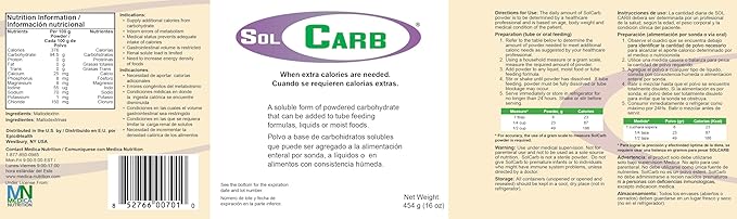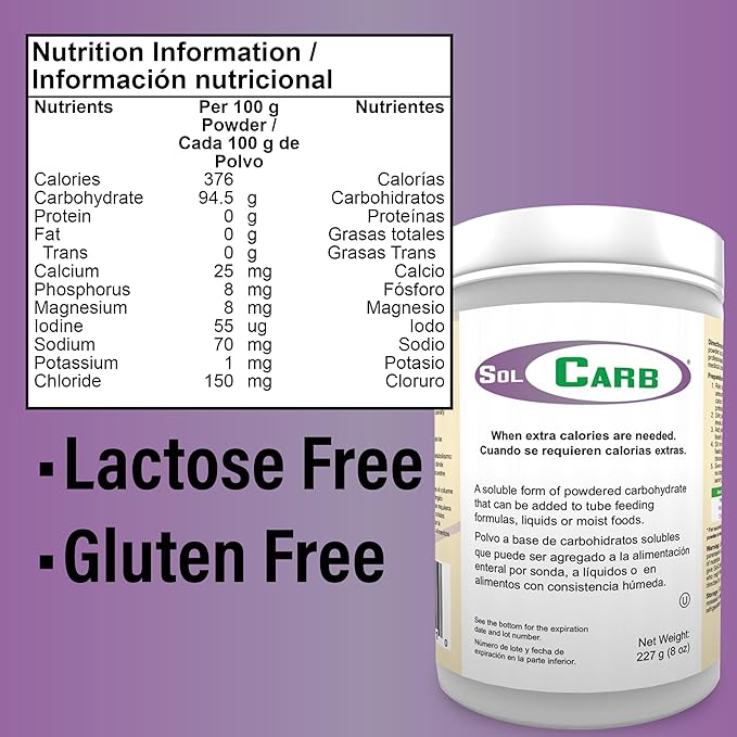 • SolCarb Unflavored Carbohydrate Powder Supplement, 454g Can – Easily Mixes into Liquids and Foods, Lactose-Free, Gluten-Free