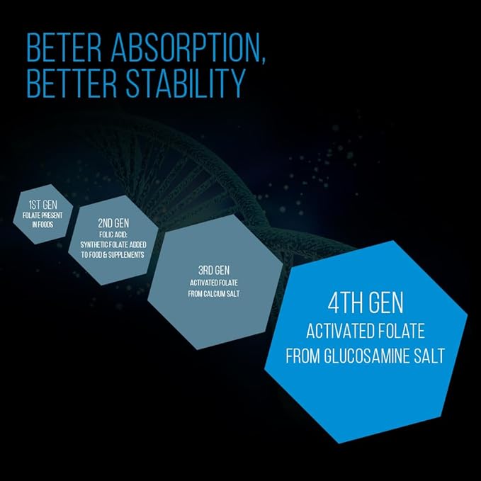 • ★ 4th generation activated folate ★ Quatrefolic Acid is the 4th level of development in folate supplements. It is stable, pure, and better absorbed than other 5-MTHF because it's bound to glucosamine instead of calcium.