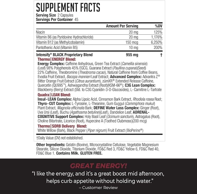• Appetite Control: Intensify BLACK’s strong thermogenic formula also includes ingredients that help reduce carb cravings and support strong appetite control.