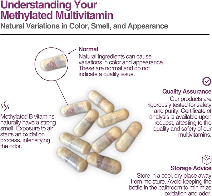• BIOAVAILABLE METHYLFOLATE FOR HOMOCYSTEINE BALANCE: Our MTHFR multivitamin without folic acid boasts Choline, methyl folate (5-MTHF), Methyl B12, B6, and other methylated B vitamins. This combination supports a healthy homocysteine balance and metabolism, contributing to overall wellness.