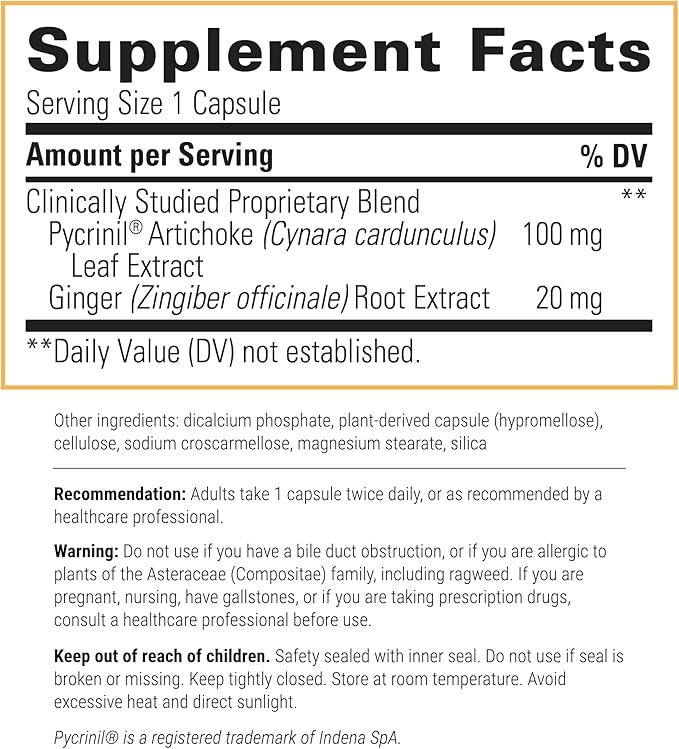 • Artichoke Leaf Extract & Ginger Blend: This supplement contains a proprietary blend of ginger root and artichoke leaf extracts
