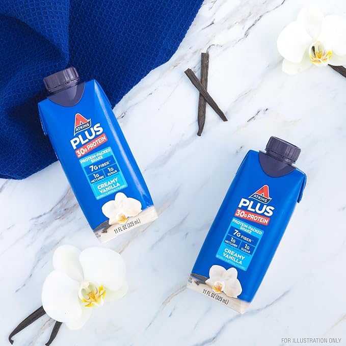 Atkins Creamy Vanilla PLUS Protein Shake, 30g Protein, 7g Fiber, 1g Net Carb, 1g Sugar, Keto Friendly, Low Carb, High Protein Drink, 12 Count