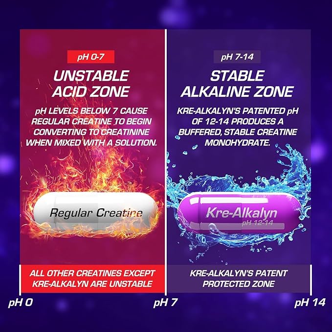 • MULTI-PATENTED PH-CORRECT CREATINE by Dr. Jeff Golini: Kre Alkalyn EFX offers a superior alternative to other creatine products. Traditional creatine supplements have pH levels below 7, which immediately begin converting to creatinine — a useless waste product — when mixed with a solution. Kre Alkalyn EFX, however, has a multi-patented pH range of 12-14, resulting in a buffered, stable creatine monohydrate. This means you only need 1.5-3 grams with no loading, no bloating, and no side effects!