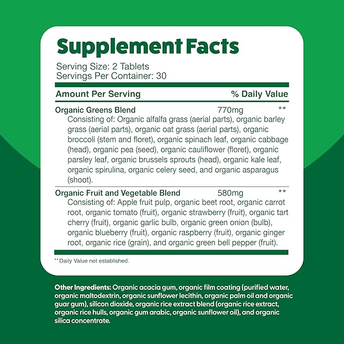 • NO FILLERS: Our vitamins and supplements contain a 770mg blend of greens including alfalfa, barley, oat, and broccoli grass. These superfood tabs also have a 580mg blend of fruits and veggies vitamins from apple, beetroot, carrot, tomato, and strawberry. This leaves no room for fillers. We use only the finest ingredients.