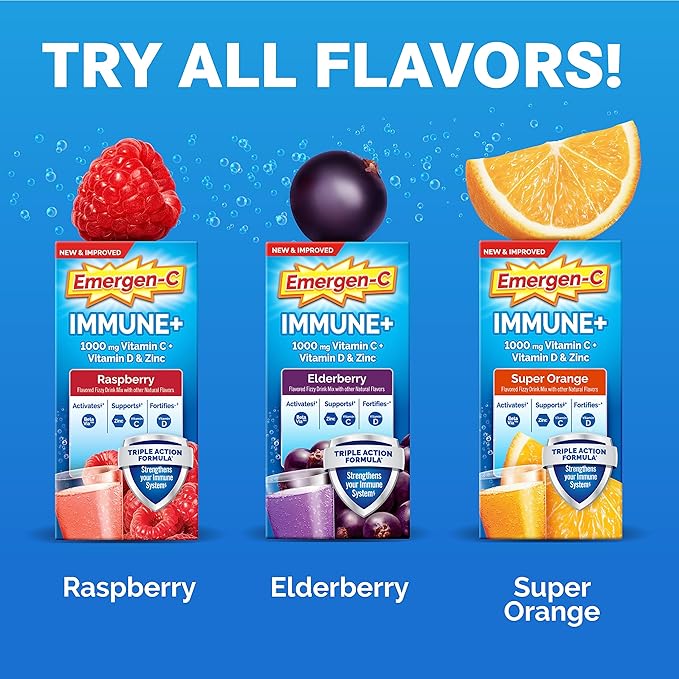 • 50ct of Emergen-C Immune+ Triple Action Immune Support Powder, with 200mg of BetaVia (R), 1000mg Vitamin C per serving, B Vitamins, Vitamin D, Zinc and Manganese (2)