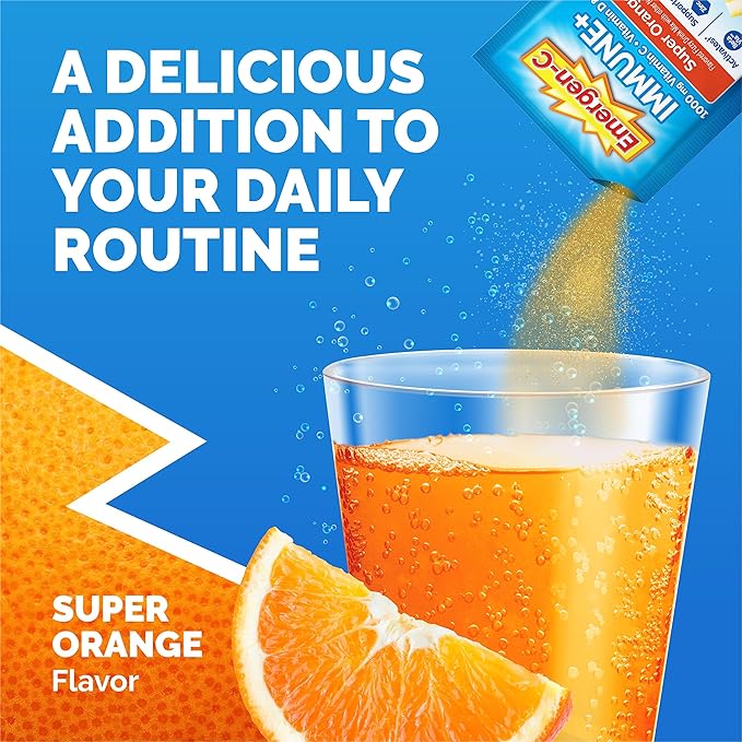 Emergen-C Immune+ Triple Action Immune Support Powder, BetaVia (R), 1000mg Vitamin C, B Vitamins, Vitamin D and Antioxidants, Super Orange – 50 Count