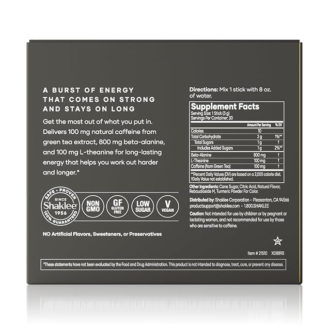 Shaklee - Performance Pre-Workout Energy Drink - Green Tea Extract Lemon Flavor - Energy Boost - Beta-Alanine & L-theanine - 100mg Caffeine, 800mg Beta-Alanine and 100mg L-theanine - 30 Servings