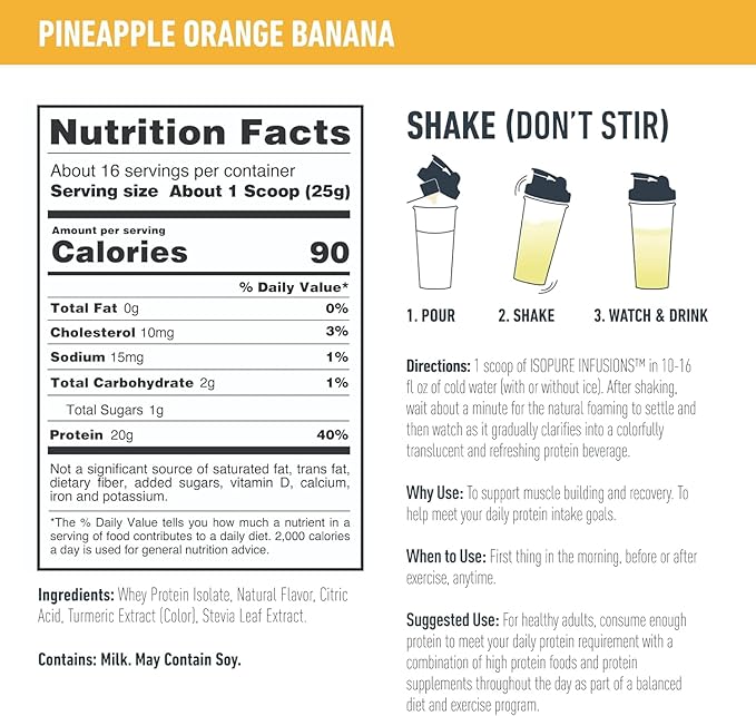 • REFRESHING FLAVOR: Isopure Infusions Pineapple Orange Banana delivers a juicy, thirst quenching fruity burst of flavor making it tastier than ever to add more protein to your day.