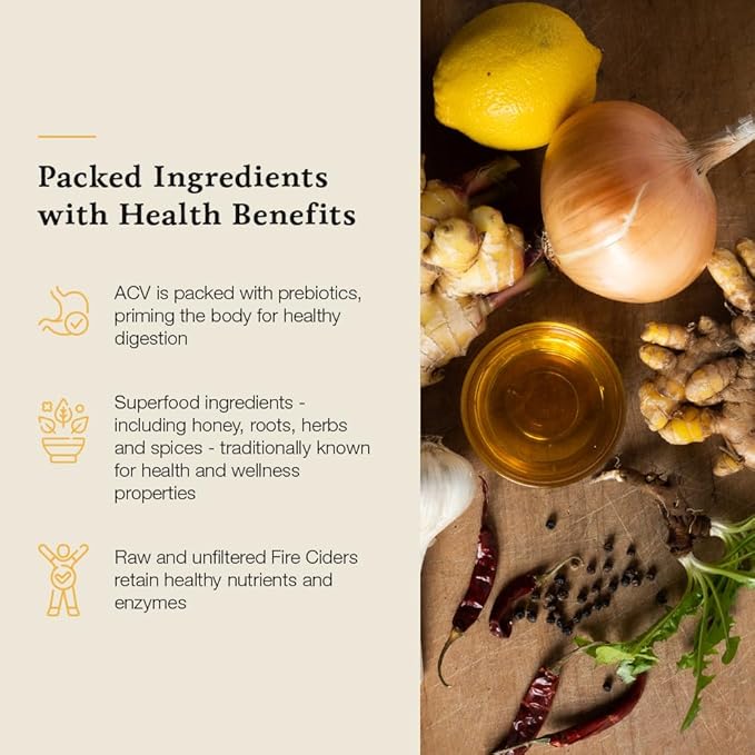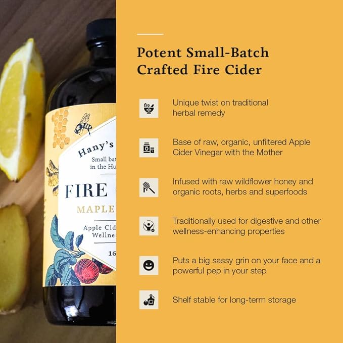 • Hany's Harvest Maple Honey Fire Cider: Our Apple Cider Vinegar is a meticulously handcrafted tonic made from apple vinegar, organic unsweetened ingredients, and a blend of natural spices. This carefully crafted small-batch wellness tonic elixir supports your immune system and aids digestion, offering a bold and spicy flavor that adds a zesty kick to your daily wellness routine.