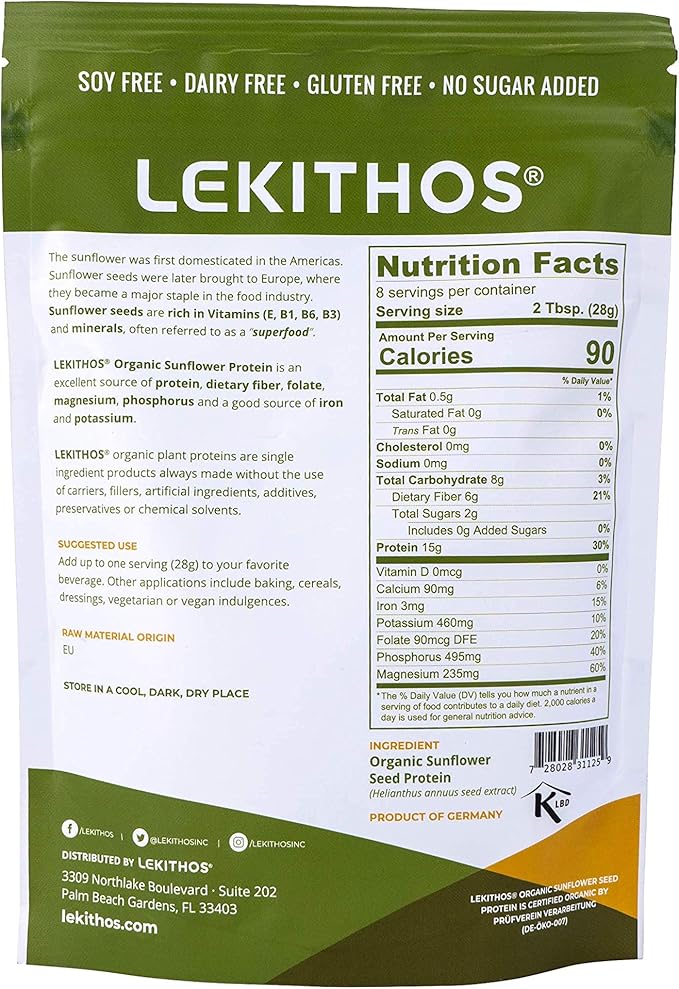 • Diet-Friendly and Inclusive: Free from major allergens like soy, dairy, and gluten, Lekithos Organic Sunflower Seed Protein accommodates various dietary preferences and restrictions.