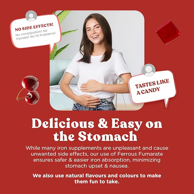 • Juicy Cherry Flavor - Bursting with sweet cherry goodness, our individually wrapped iron chewables are your ticket to on-the-go wellness. The fusion iron supplement leaves taste buds dancing with delight, without a metallic aftertaste or indigestion