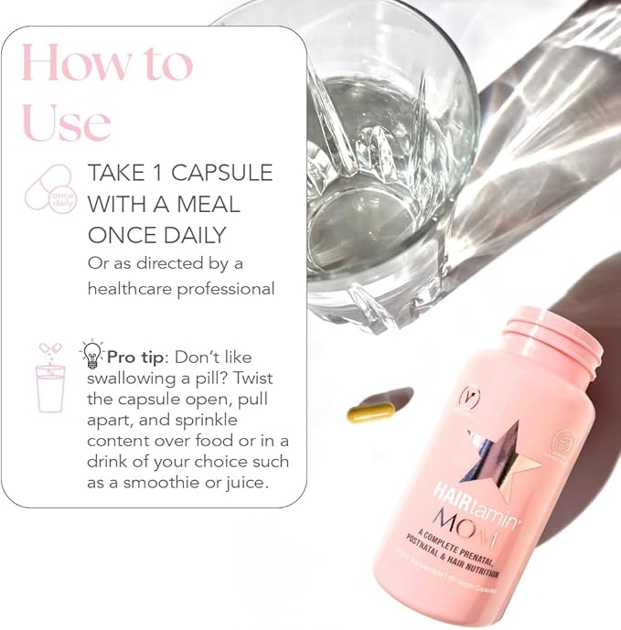 HAIRtamin MOM Vegan Prenatal & Postnatal Multivitamin Supplement & Hair Vitamin Pregnancy, Postpartum, Breastfeeding Probiotic One-a-Day Hair Vitamins with Biotin, Zinc, Iron (30 Counts)
