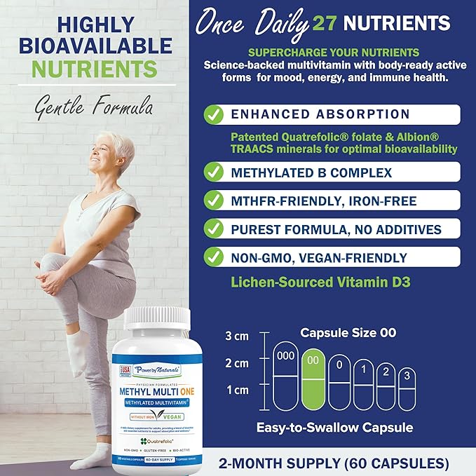 Power By Naturals Methyl Multi One - Vegan Methylated Multivitamin for Men & Women with Methylfolate & Methyl B12 for MTHFR Maintenance, 60 Capsules, 2 Month Supply, USA-Made, Gluten-Free
