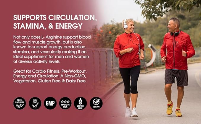 • SUPPORTS CIRCULATION, STAMINA, & ENERGY Not only does L- Arginine support blood flow and muscle growth, but is also known to support energy production, stamina, and vascularity making it an ideal supplement for men and women of diverse activity levels.