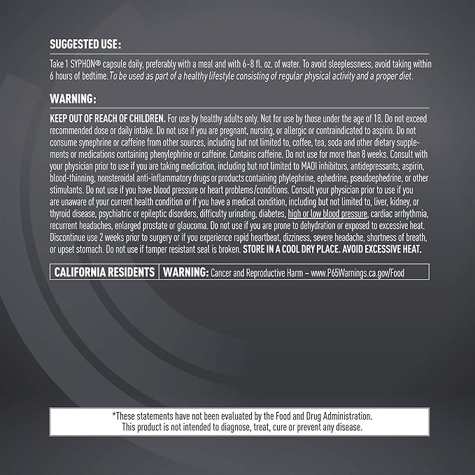 • Daily Energy And Focus: This enriched thermogenic formula features a high-quality blend of ingredients that provide intense energy, focus, and mental performance. SYPHON is just 1 capsule a day, so use it to help jumpstart your body and perform at peak levels daily.