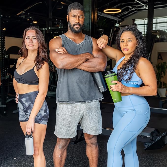 • DURABLE CONSTRUCTION — Kitchen-grade metal shaker bottle resists odors and stains. The silicone base prevents sliding and reduces noise when set down. Our Gym shaker bottle fits standard cup holders for easy transport and Internal measurement lines help this workout bottle ensure precise mixing