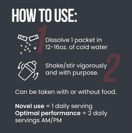 • Suggested Use :- Dissolve 1 packet in 12-16oz. of cold water & shake/stir vigorously and with purpose. Can be taken with or without food.