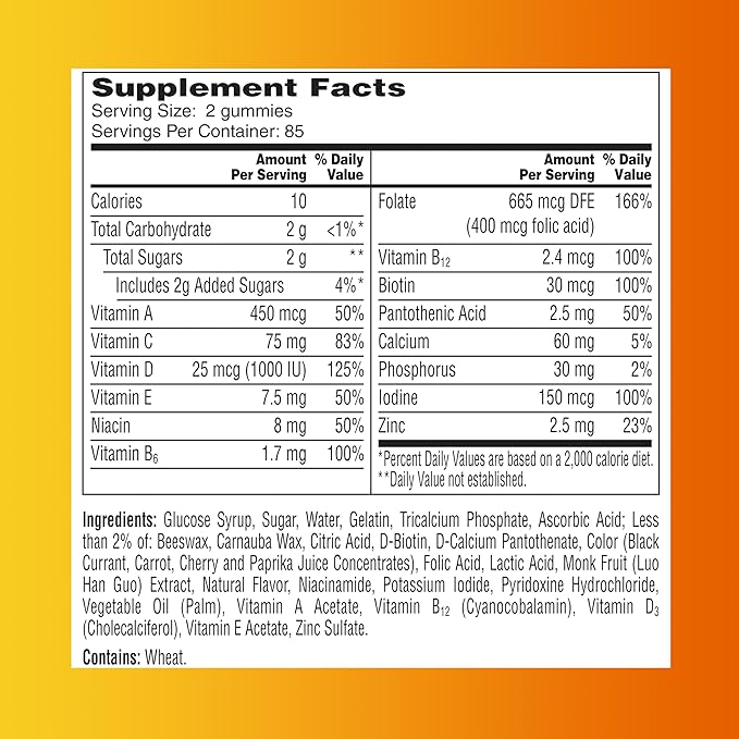 • Contains key nutrients like Vitamins A, B12, B6 , C, D, E, Folic Acid, Biotin,1 Iodine, Zinc, and Calcium