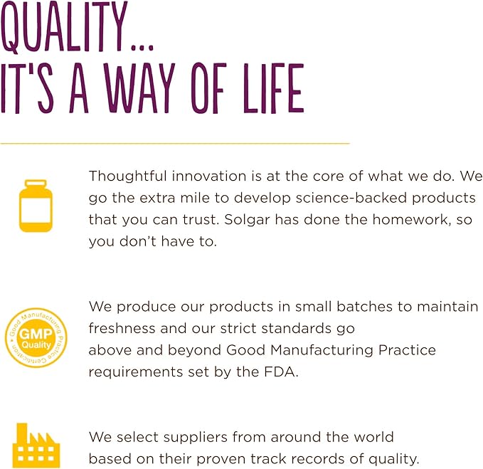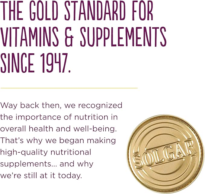 • The Gold Standard; For over 70 years Solgar has been committed to quality, health, and well-being. Our mission is to create the finest nutritional supplements in small batches, through tireless research, using only the finest raw materials