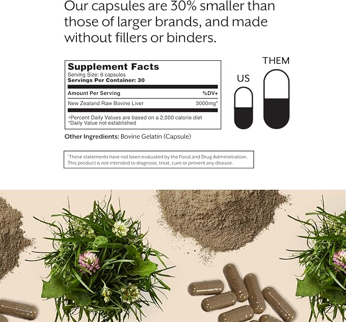 • What’s Inside: A serving of our Liver Supplement is packed with 3,000mg of New Zealand Bovine Liver, a highly bioavailable source of vitamin A, B12, D3, and heme iron.