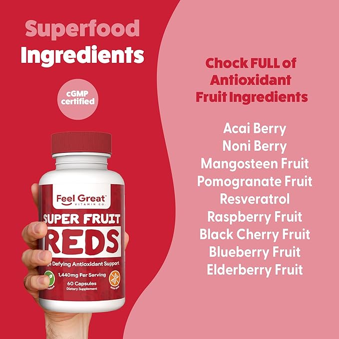 Feel Great Vitamins Superfruit Reds – Antioxidant Superfood with Polyphenols for Anti-Aging & Immune Support – Acai, Mangosteen, Pomegranate, Blueberry & Much More – 60 Capsules