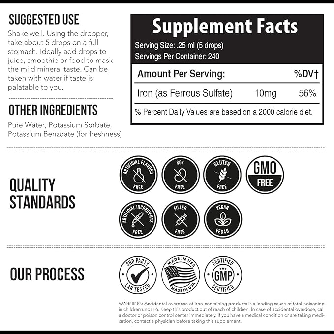 • BEST VALUE: Not only do we offer the most potent and bioavailable form, but we also offer the best value with 236 servings per bottle. Other Liquid Iron supplements offer only 25 servings per bottle.