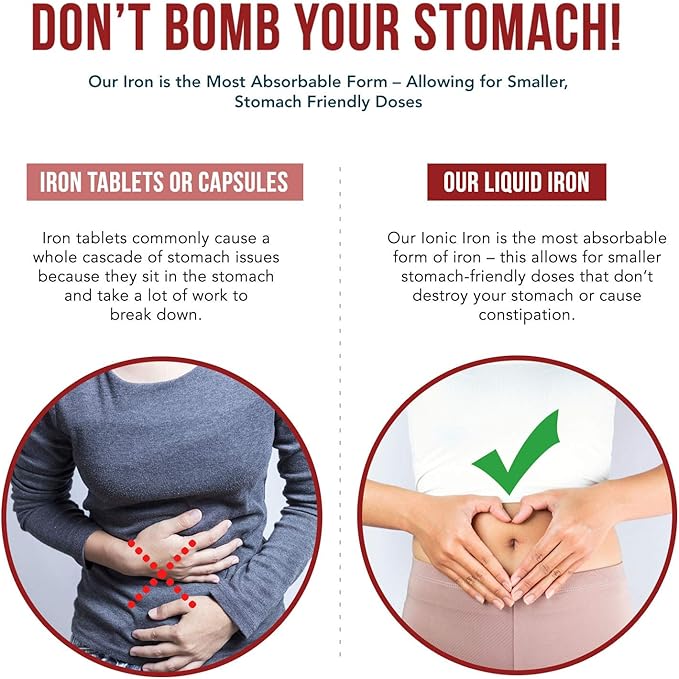 • HIGHEST ABSORPTION RATE = SMALLER DOSE & LESS STOMACH ISSUES: This is the most bioavailable form of iron in its natural ionic form. The increased bioavailability allows you to take smaller doses and avoid stomach irritation or constipation. The liquid form also allows it to be immediately absorbed through the intestine without any work by the stomach.