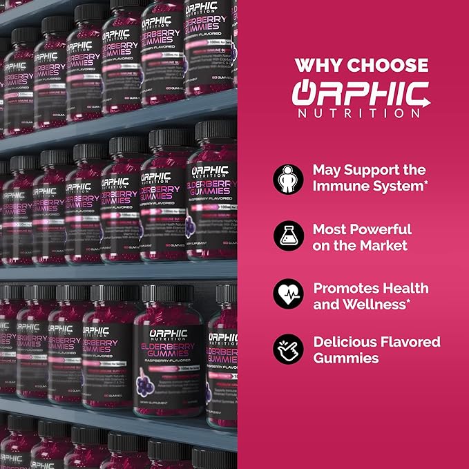ORPHIC NUTRITION Elderberry Gummies with Vitamin C and Zinc - 60 Count - Immune Support Supplement for Men, Women and Kids* - Elderberry Vitamins Made with Vitamin C - 100MG of Elderberry