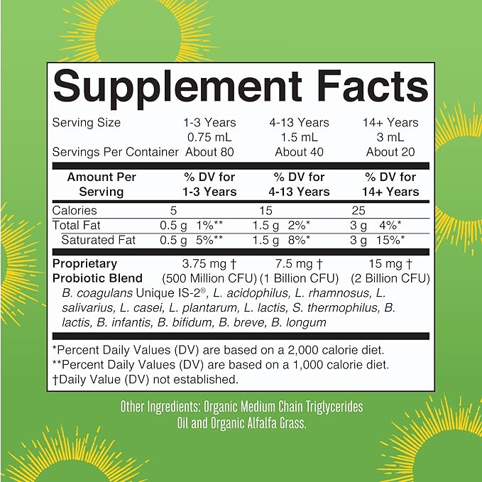 • Special Ingredients : 13 Strains, Organic Alfalfa Grass, Acidophilus, Organic Medium Chain Triglyceride (MCT) oil