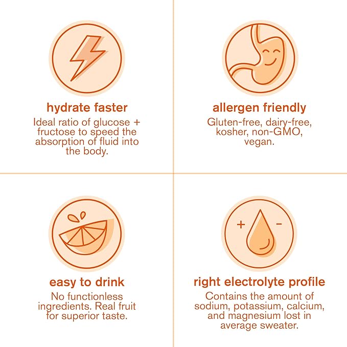• ORANGE: Vegan, plant based, verified non-GMO, gluten free, dairy free and Kosher. Only real fruit used for flavor and a light, refreshing taste. 50% less sugar and 2x the sodium of the leading sports electrolyte drinks*