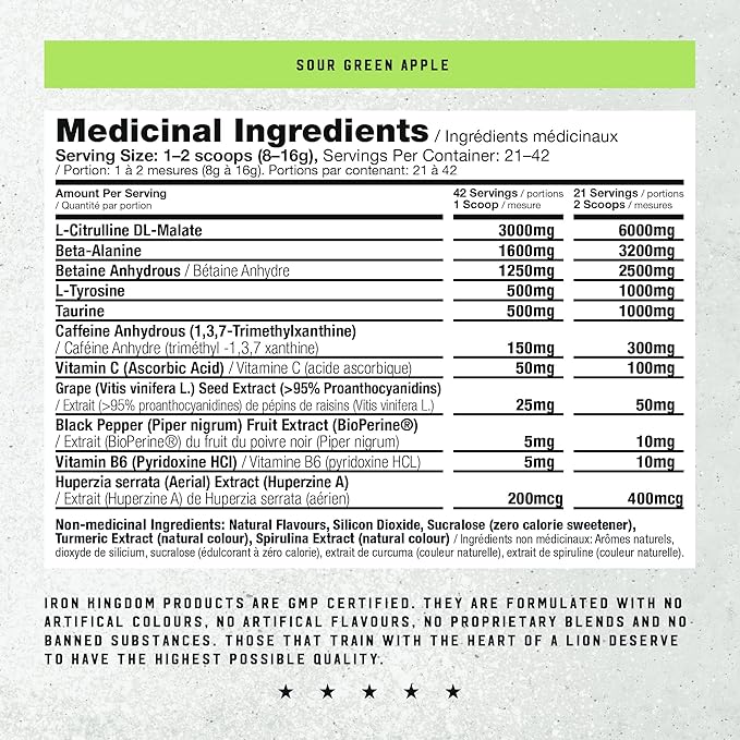 Iron Kingdom Pre Workout Powder for Men & Women Caffeine, Beta Alanine & Aminos for Intense Focus Endurance & Pump - Preworkout Energy Drink Powder Natural Sour Green Apple - 42 Servings