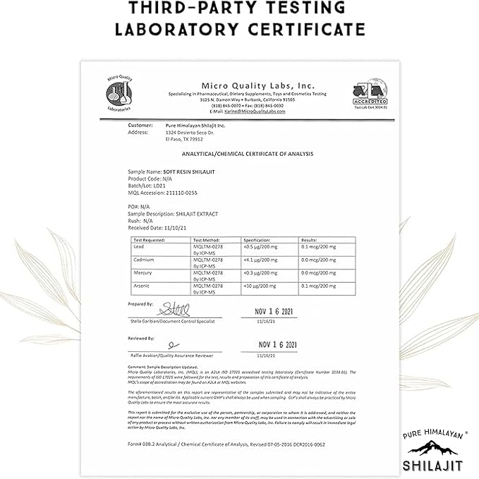 • WHAT YOU GET: Packaged in a light-protected glass jar with a measuring spoon and instructions, our shilajit is easy to use and store. Furthermore, each batch undergoes thorough analysis for safety by a third-party US laboratory, ensuring peace of mind and quality assurance for our customers.