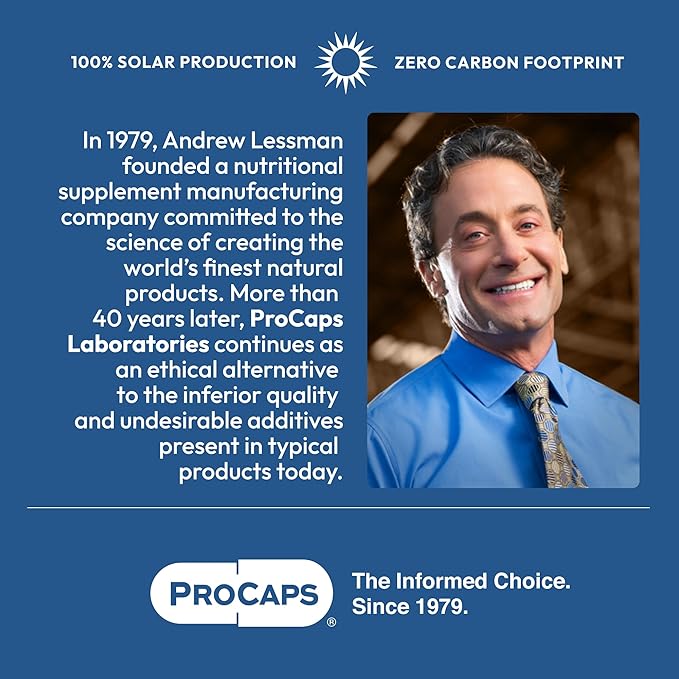 • ETHICAL & ECO-FRIENDLY. ZERO CARBON FOOTPRINT – Uniquely committed to your health and the health of the planet, ProCaps’ facilities are 100% Solar Powered with a Zero Carbon Footprint and an LEED GOLD green building status. ALL ProCaps bottles are made from 100% recyclable post-consumer resin. Plus, Andrew Lessman and ProCaps are the largest donor of prenatal vitamins in the world (over 1.5 billion capsules donated to date). ProCaps, the Informed Choice for Nutritional Supplements.