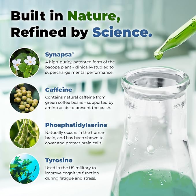 • CLINICALLY STUDIED INGREDIENTS: Built by nature and refined by science, we've utilized premium ingredients proven to enhance cognitive function, including bacopa, L taurine, natural caffeine, GABA, L tyrosine, and Huperzine A.