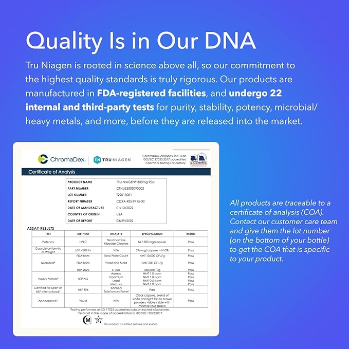 • TESTED FOR SAFETY, POTENCY, AND PURITY – Tru Niagen is one of the most well-studied, patented, supplements. Our Patented Ingredient Niagen has achieved regulatory acceptance by the US FDA for use in supplements: twice as an NDI (New Dietary Ingredient), and once as GRAS (Generally Recognized As Safe). Every Batch is made in the United States with globally sourced ingredients and third-party tested by ISO/IEC accredited labs for potency, safety, and purity. Tru Niagen NAD+ capsules are vegetarian, gluten free, nut free, caffeine free, and have no artificial flavors or colors.