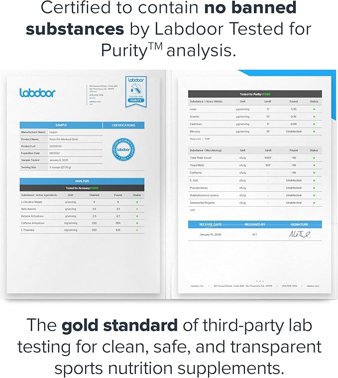• Tested for purity and potency in an ISO 17025 accredited third-party lab, and independently certified to contain no contaminants or banned substances by Labdoor. Every bottle of our Pulse pre work out is guaranteed to provide exactly what the label claims and nothing else.