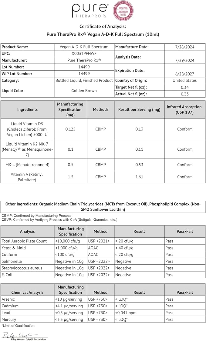 • 𝐕𝐄𝐆𝐀𝐍-π…π‘πˆπ„ππƒπ‹π˜ π…πŽπ‘πŒπ”π‹π€: Our Vegan A-D-K Full-Spectrum drops are 100% vegan and free from potential allergens such as GMOs, soy, alcohol and gluten. Our Vitamin D3 source, Pureshine, is sustainably harvested from a renewable plant-based source, providing a vegetarian solution for much-needed Vitamin D3 support.
