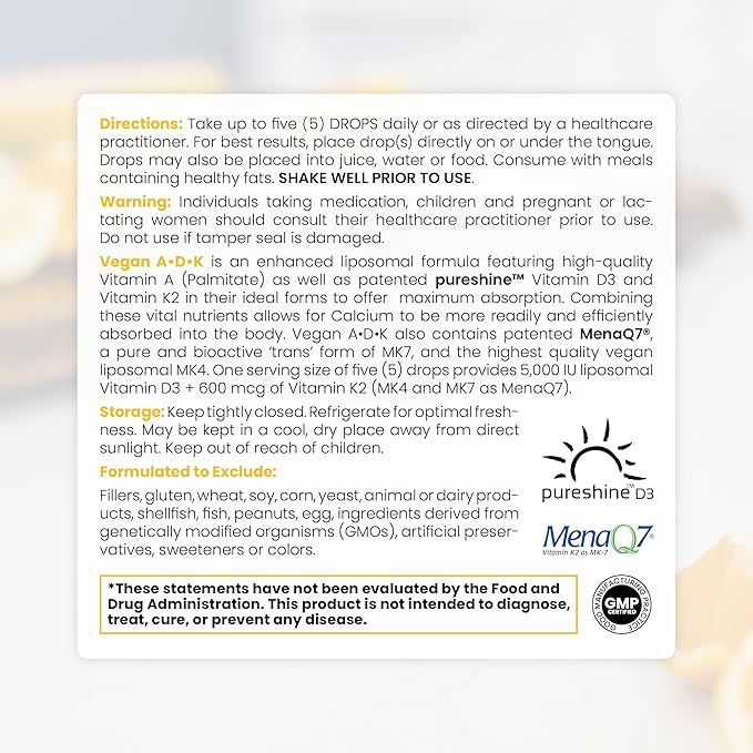 • 𝐀𝐃𝐕𝐀𝐍𝐂𝐄𝐃 π‹πˆππŽπ’πŽπŒπ€π‹ π…πŽπ‘πŒπ”π‹π€: Our practitioner-recommended vegan Vitamin A, Vitamin D3 & Vitamin K2 formula utilizes 100% liposomal liquid Vitamin D3 & K2 for maximum absorption. Multiple scientific studied have proven that liposomal nutrients aborb faster and more eficiently, and are better utilized by your body. Purity is prority.