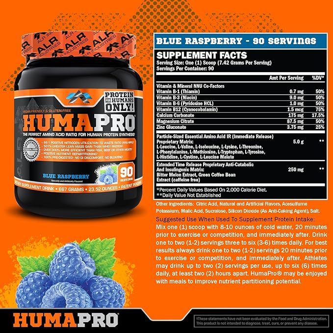 Humapro | Amino Acids Protein Matrix for Humans | 99% Utilization for Lean Muscle | Vegan, Gluten Free | 667g / 90 Servings (Blue Raspberry)