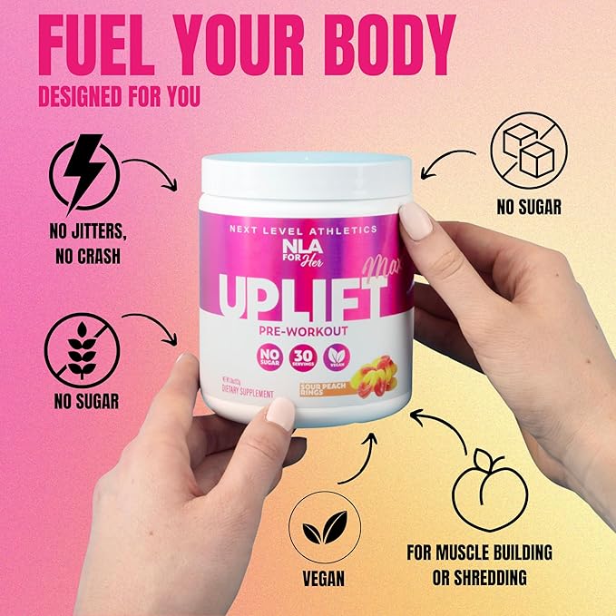 Uplift MAX Pre-Workout Energy For Women (Sour Peach Rings)- 30 Servings- Clean/Sustained Energy, Supports Athletic Performance, Helps Fast Twitch Muscle Fiber Activation (Caffeine, Vegan, GF, 15 Cals)