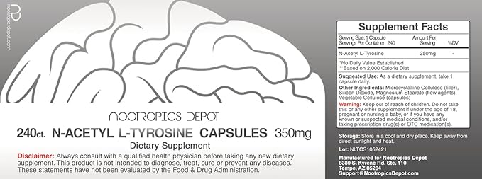 Nootropics Depot N-Acetyl L-Tyrosine Capsules | 350mg | 240 Count | NALT | Amino Acid Supplement | Natural Supplement | Supports Memory, Learning, Focus, Healthy Stress Levels