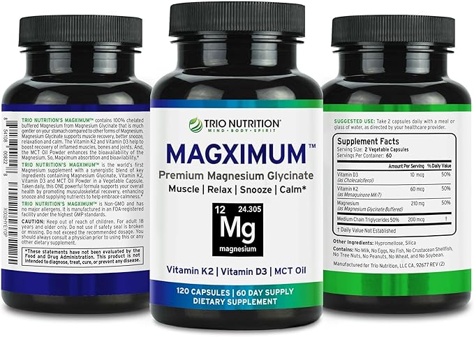 • Trio Nutrition's Magximum Capsules are the world's first Magnesium Supplement with Magnesium Glycinate, Vitamin K2, Vitamin D3, and MCT Oil in a veggie capsule. One powerful formula with maximum absorption and superior impact. A 60-day supply of 100% chelated, buffered magnesium in the form of pure Magnesium Glycinate. *