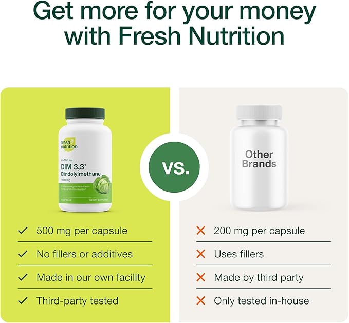 • Fresh Nutrition's DIM supplement features a consistent dosage of 500mg per serving, verified for quality through independent third-party testing. Each bottle contains 90 capsules, designed for a one-month supply based on the recommended intake of three capsules daily. Manufactured in the USA in a cGMP and FDA-registered facility, our DIM supplement is produced with high standards, using carefully sourced ingredients without fillers or additives. Additionally, each product undergoes third-party t