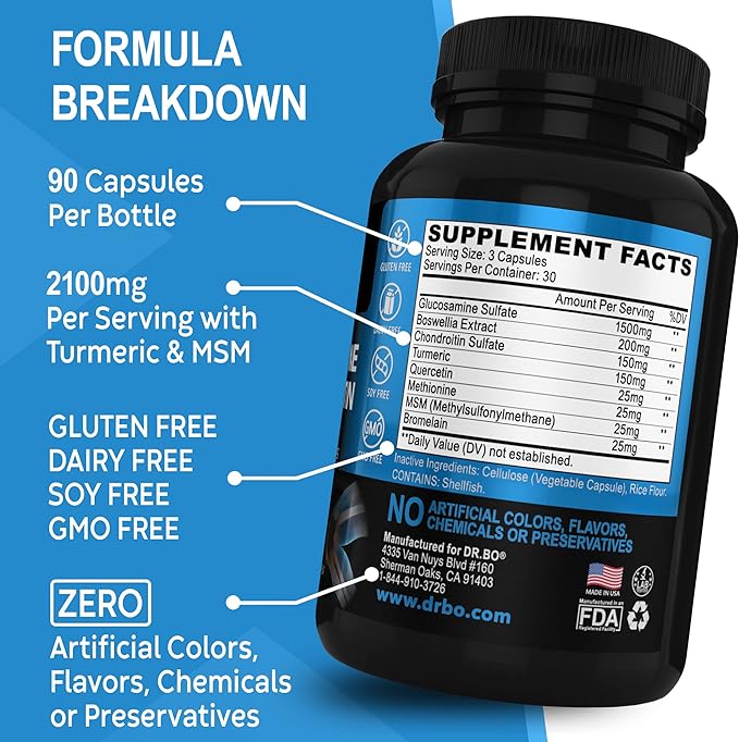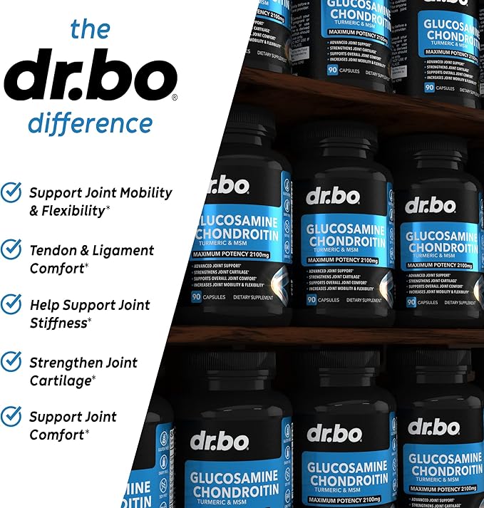 • Glucosamine Sulfate Capsules: Dr. Bo Glucosamine Chondroitin MSM capsules formula is premium triple strength pills made in USA for hip, bone, knee health for joint supplements for men women & adults