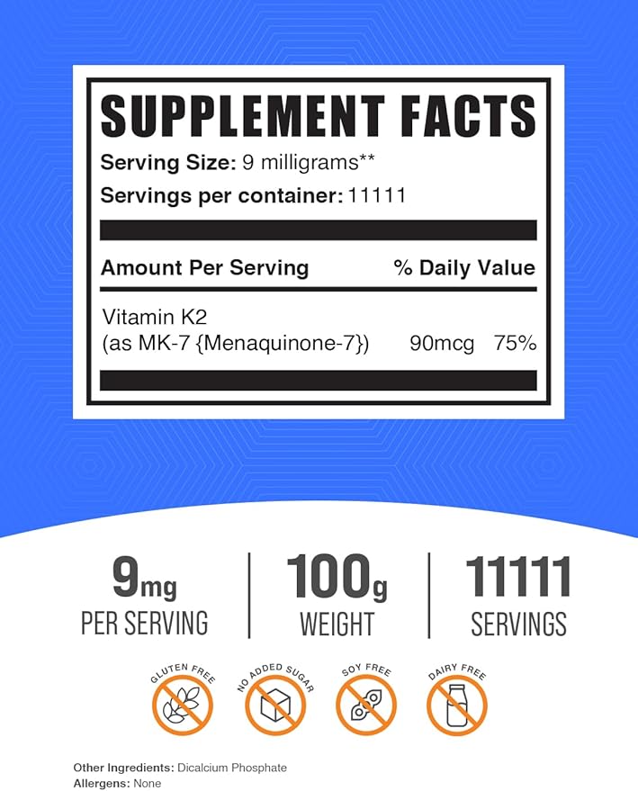 BulkSupplements.com Vitamin K2 Powder - Vitamin K2 MK-7, as Menaquinone Powder - K2 Vitamin Supplement for Wellness, Gluten Free, 9mg per Serving, 100g (3.5 oz) (Pack of 1)