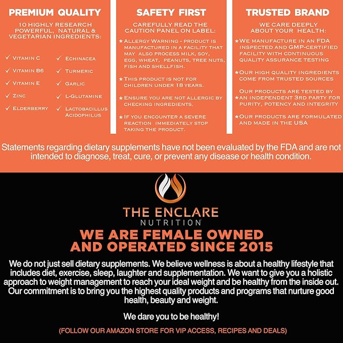 • ALL-in-1 Immune System Support Supplement: A complete immunity support supplement multivitamin for Emergency and Year-round immune support with Enclare’s 10-in-1 Power Immunity. A comprehensive Immune Booster containing 10 natural ingredients instead of just 1. Immune Support Vitamins Including Elderberry, Zinc And Vitamin C, Echinacea and Garlic.