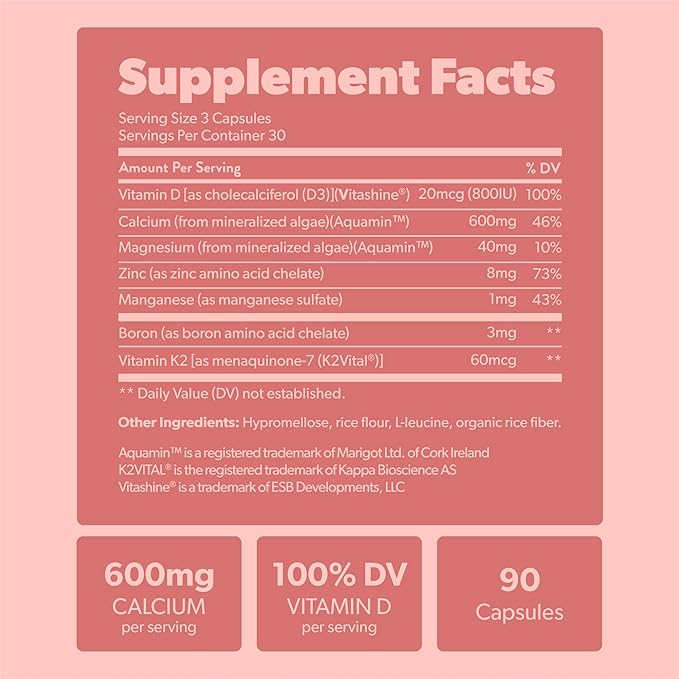 • All-In-One Formula - Our Vegan Calcium is packed with 600mg of Elemental Calcium from sustainably sourced Red Algae. Contains Vitamin K2 and D3, Zinc, Manganese, and Boron.