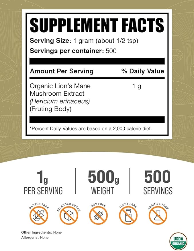BulkSupplements.com Organic Lion's Mane Mushroom Extract Powder - Lions Mane Supplement Powder, Lion's Mane Extract - Mushroom Supplement, 1000mg per Serving, 500g (1.1 lbs) (Pack of 1)