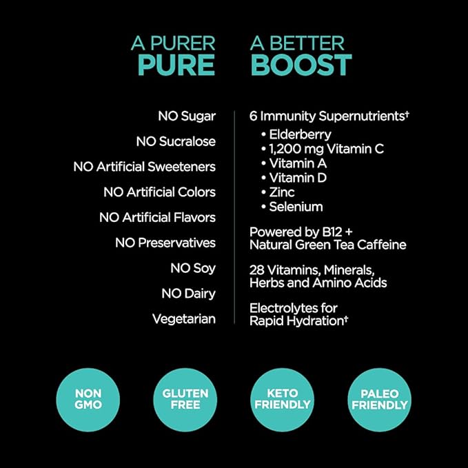 • Boost Your Energy + Immune System. Up to 6 hours of powerful clean, immune boosting energy* now packed with 28 vitamins, minerals and supernutrients like Elderberry, 1200mg of Vitamin C, Vitamin D, Vitamin A, Selenium and Zinc! Powered by natural green tea caffeine and B12 plus contains electrolytes for rapid hydration.