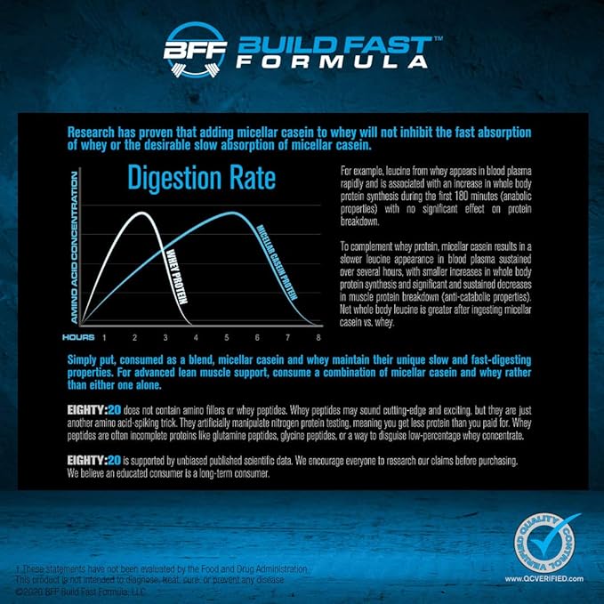 • ADVANCED MUSCLE SUPPORT FORMULA: Consisting of 80% Micellar Casein Protein (for slower absorption) and 20% Whey Protein (for faster absorption) it’s the exact ratio found in milk. This natural formula provides 6 Hours of Muscle Protein Synthesis (anabolic) and 8 Hours of Plasma Amino Acids(anti-catabolic). EIGHTY:20 stimulates muscle protein growth and recovery, while preventing muscle protein breakdown for a longer period of time, versus regular standalone protein products.